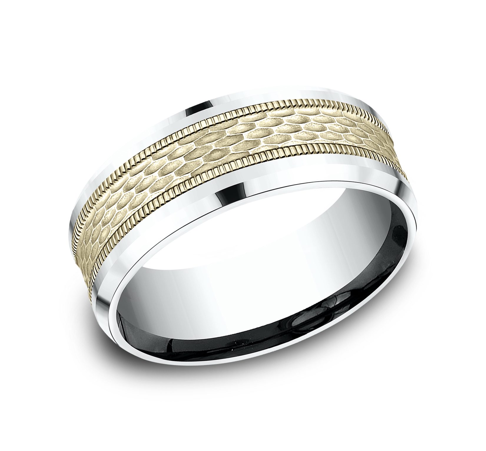 8mm, Comfort fit 14K White and Yellow Gold Mesh pattern with milgrain detail, polished bevel edges
