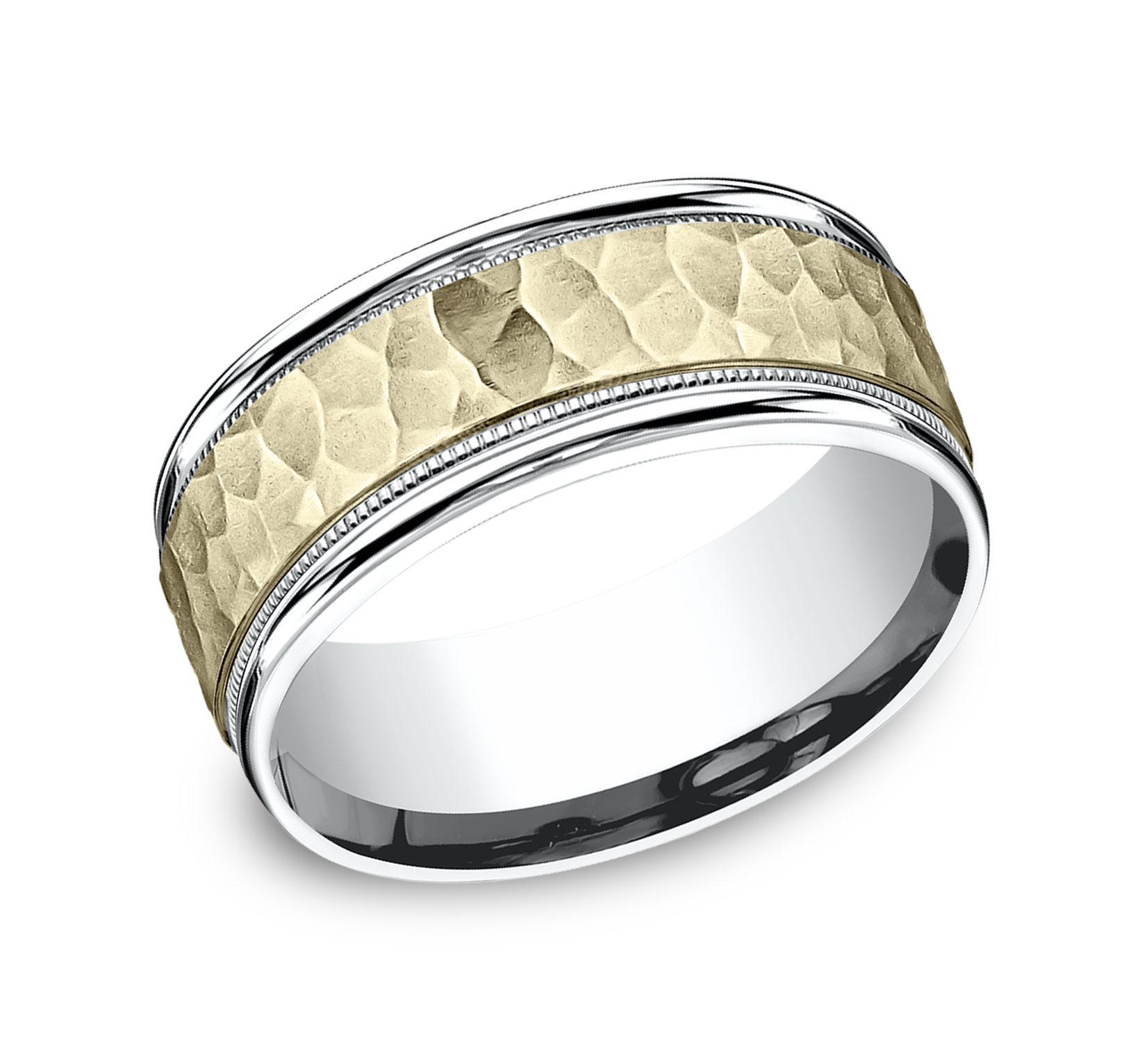 8mm, Comfort fit 14K White and Yellow Gold Hammered center, milgrain detailing, polished round edges