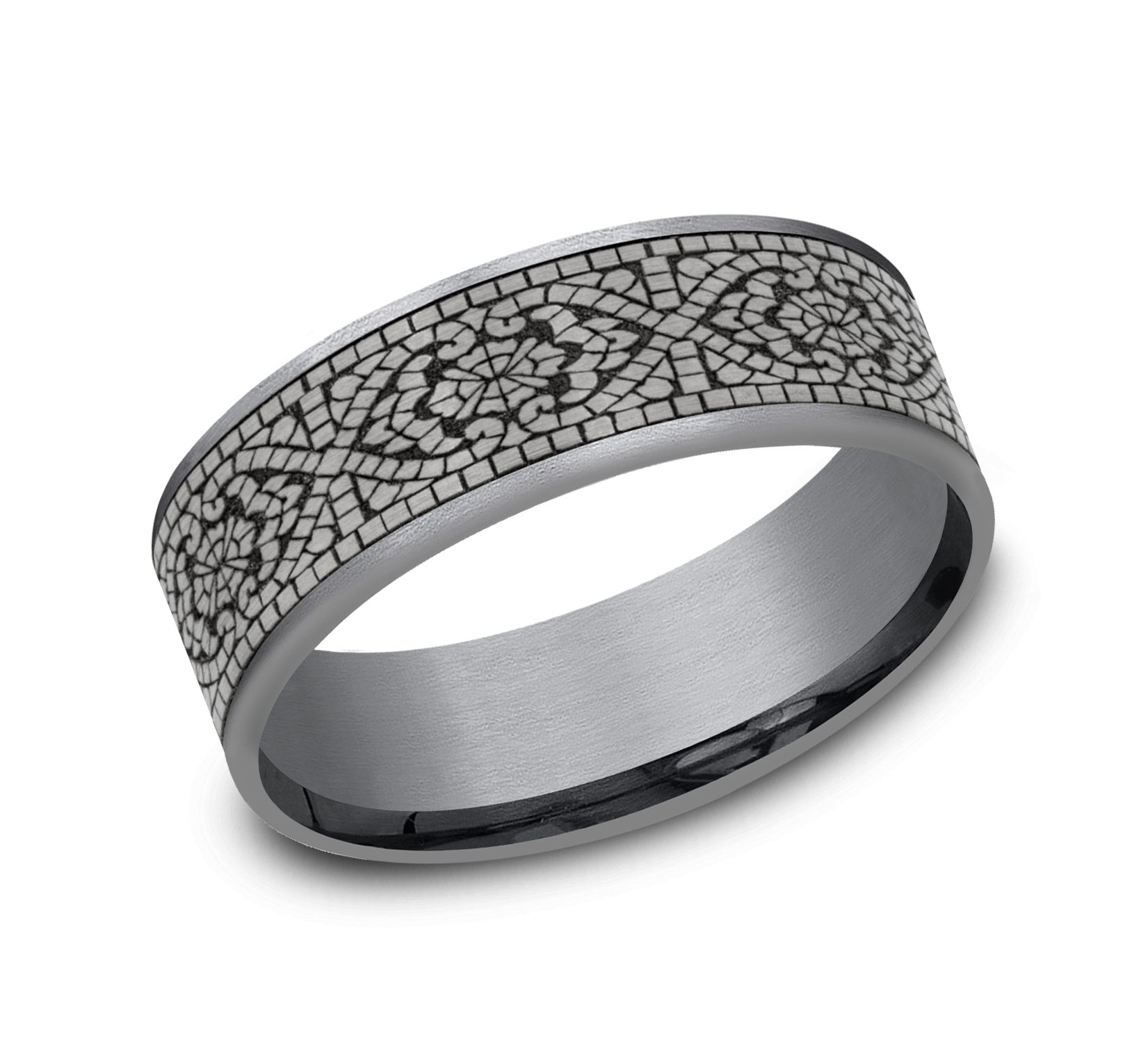 7.5mm, Comfort fit Grey Tantalum and Grey/Black Titanium Mosaic patterned center, thin edges