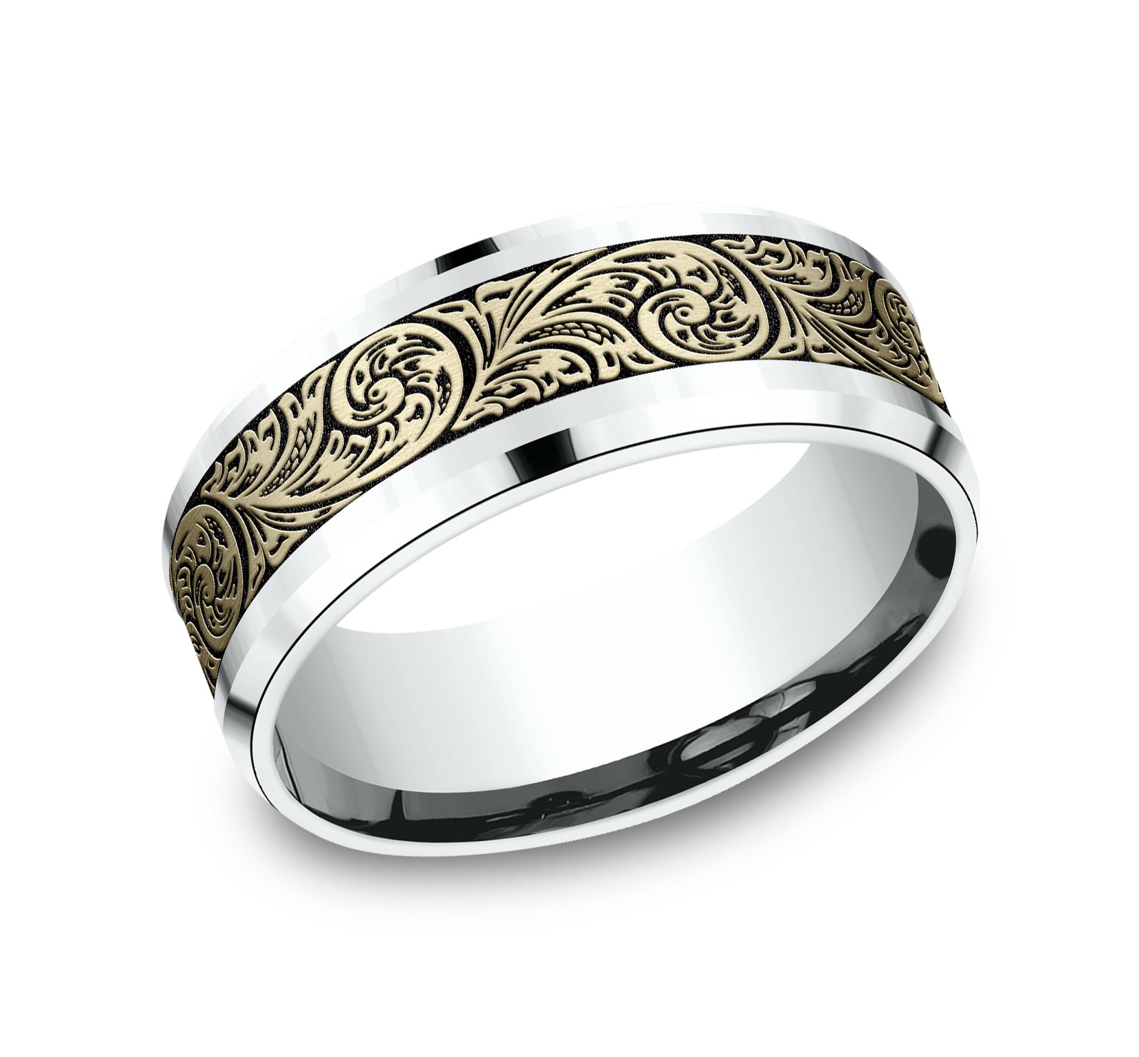 8mm, Comfort fit 14K White and Yellow Gold Vintage floral script patterned center with wear resistant black detailing, polished bevel edges