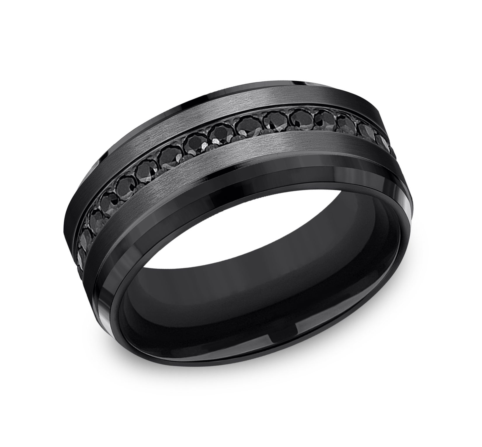 9mm, Comfort fit eternity band Black Titanium Satin finish, bevel edges Black Cubic Zirconia stones