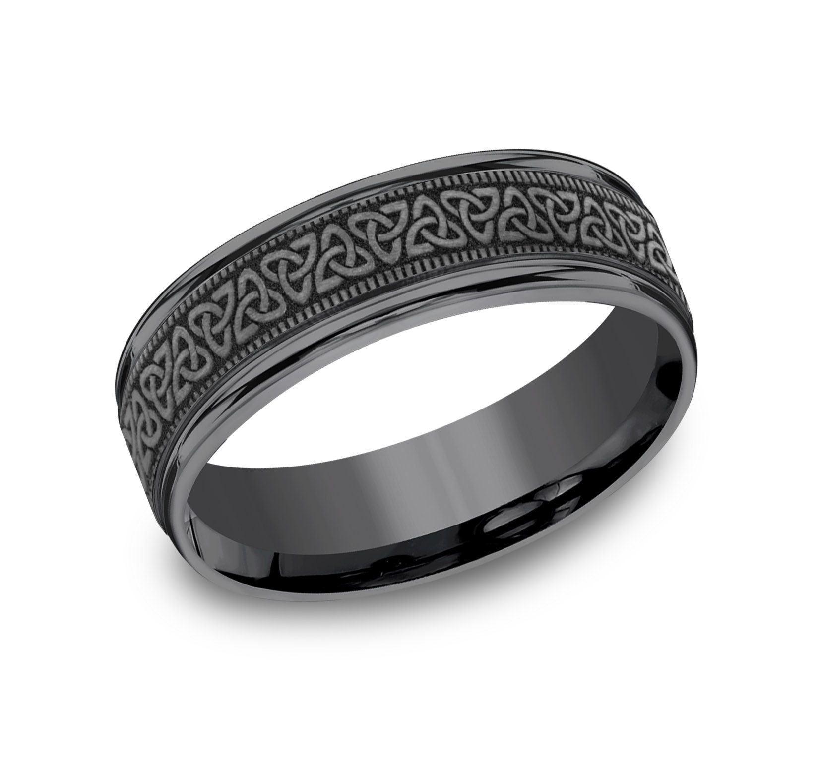 7mm, Comfort fit Darkened Tantalum Celtic knot pattern, milgrain detailing, polished round edges