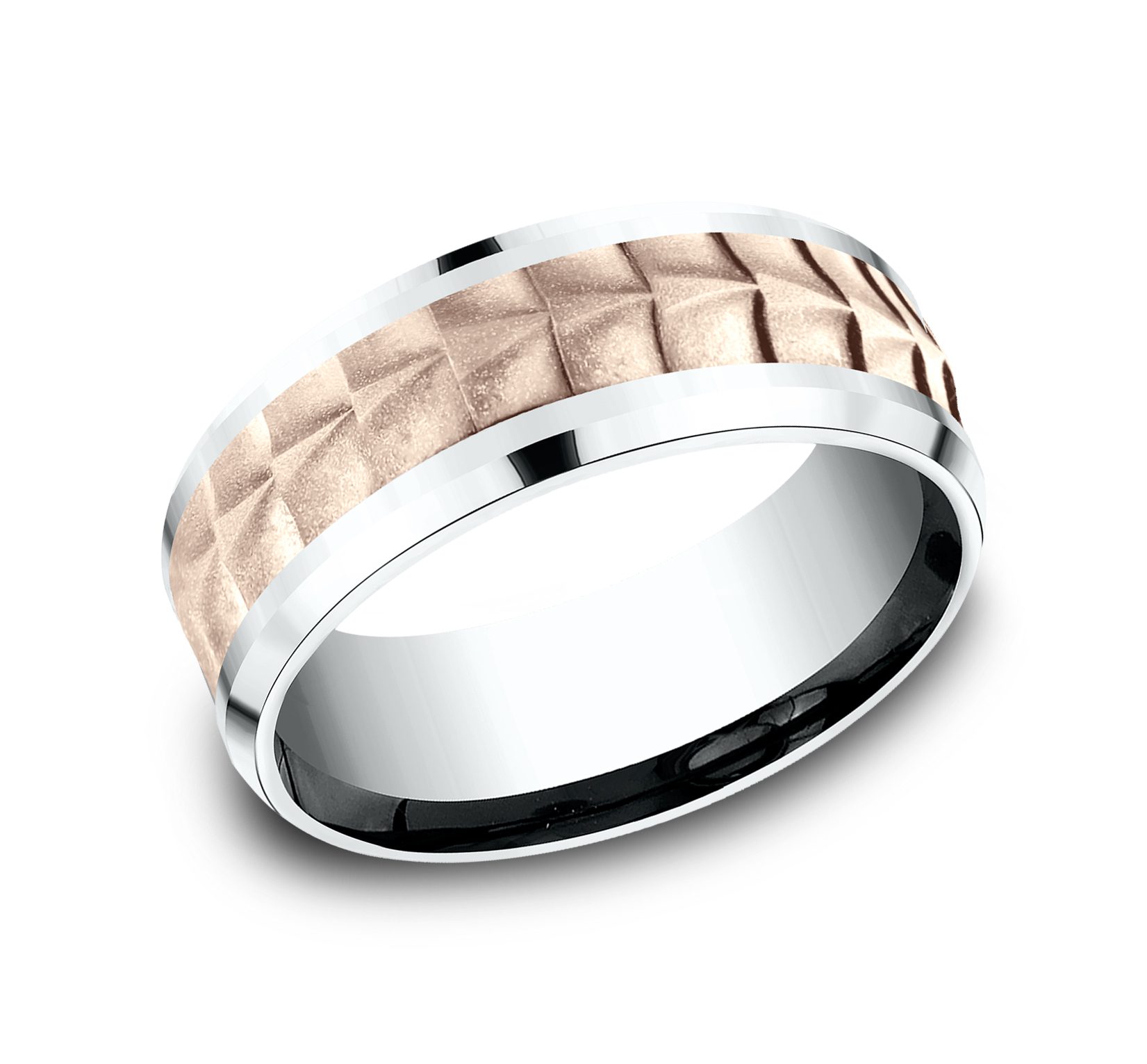 8mm, Comfort fit 14K White and Rose Gold Crocodile skin patterned center, polished bevel edges