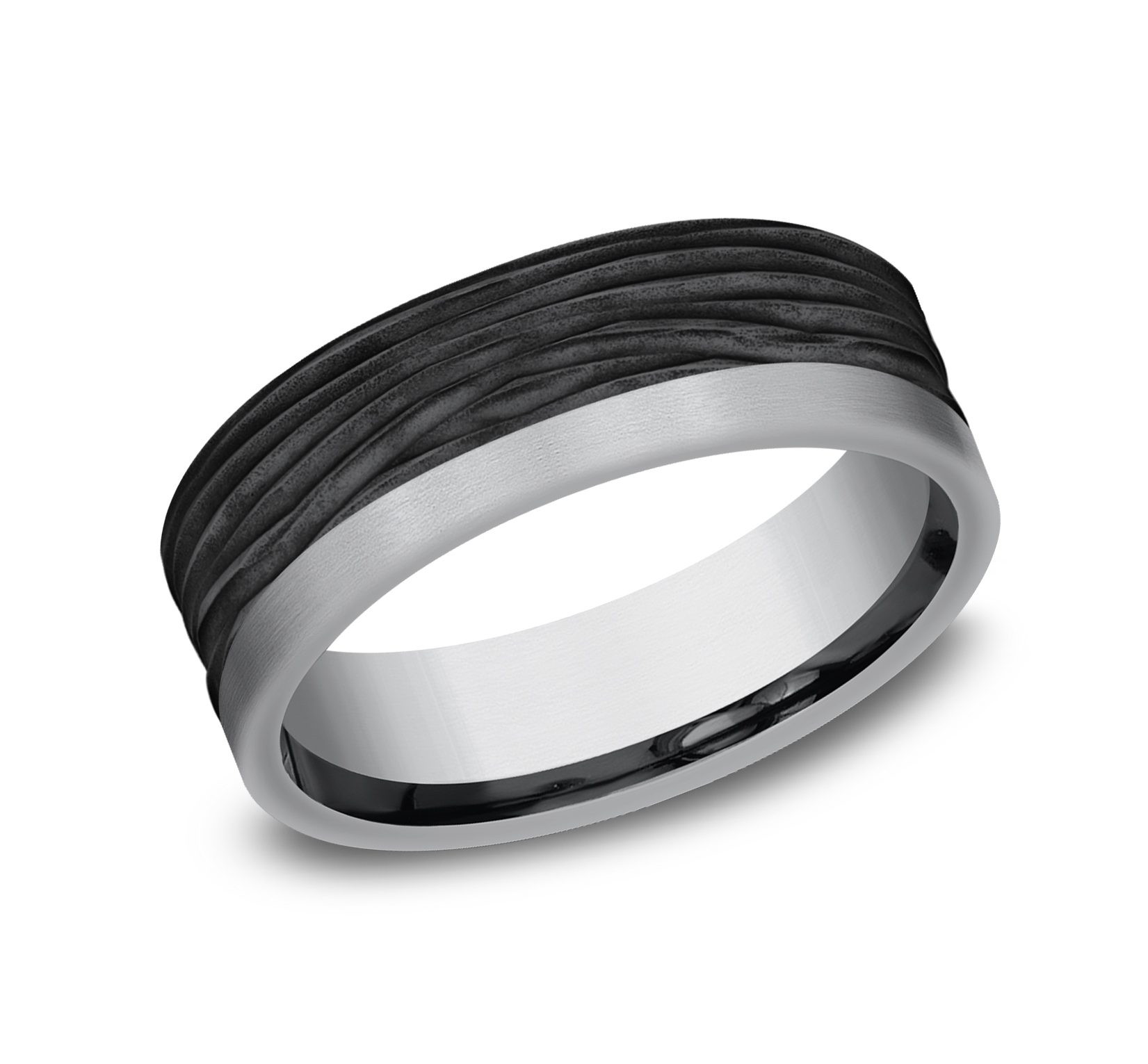7mm, Comfort fit Grey Tantalum and Black Titanium Horizontal bark pattern, one satin edge