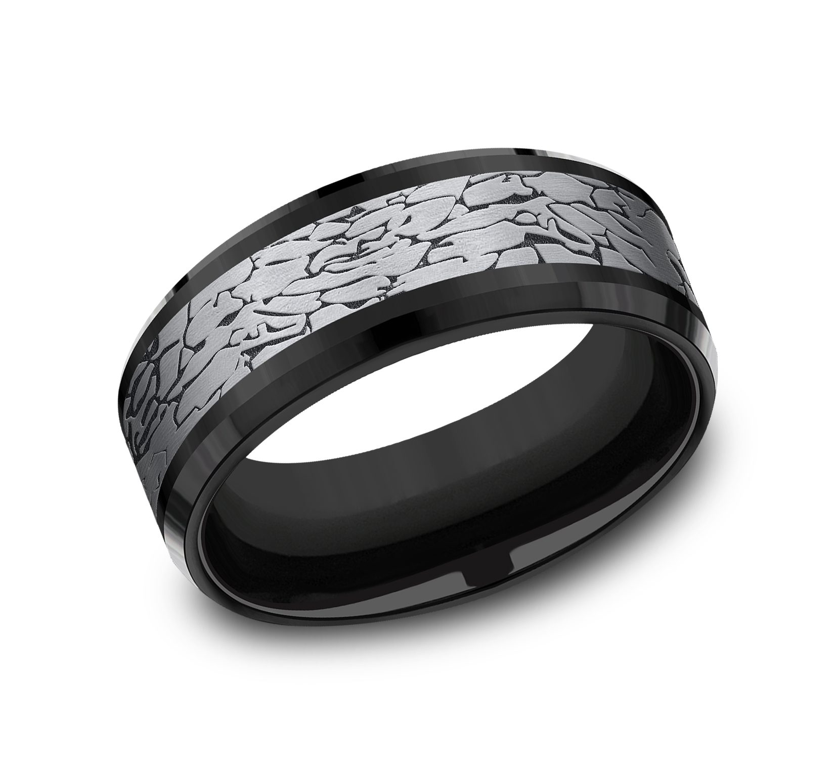 8mm, Comfort fit Black Titanium and Grey Tantalum Fractured rock pattern, polished bevel edges