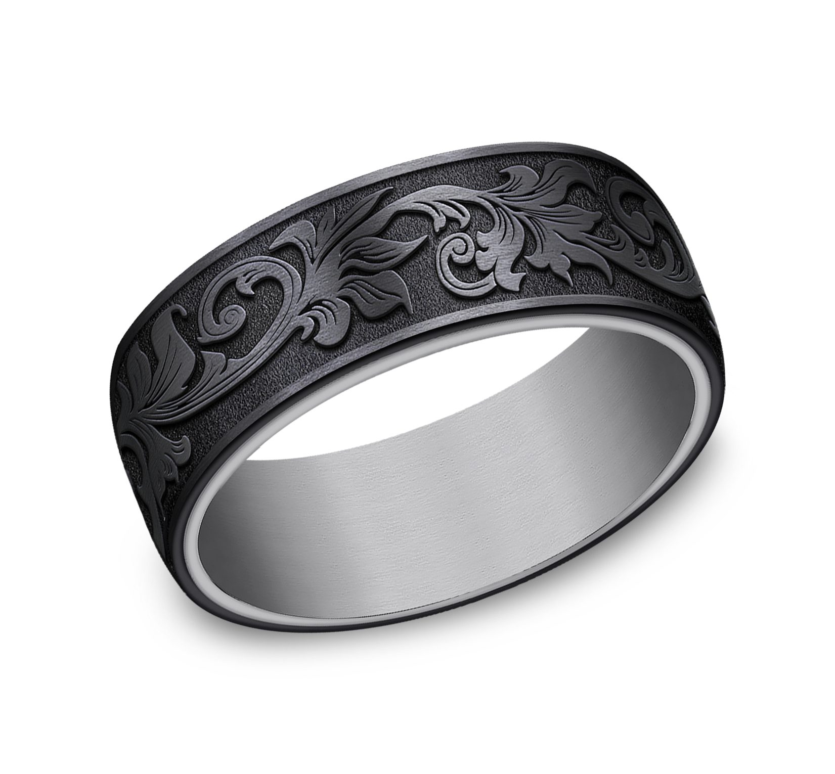 8mm, Comfort fit Grey Tantalum and Black Titanium Vintage script pattern, straight edges