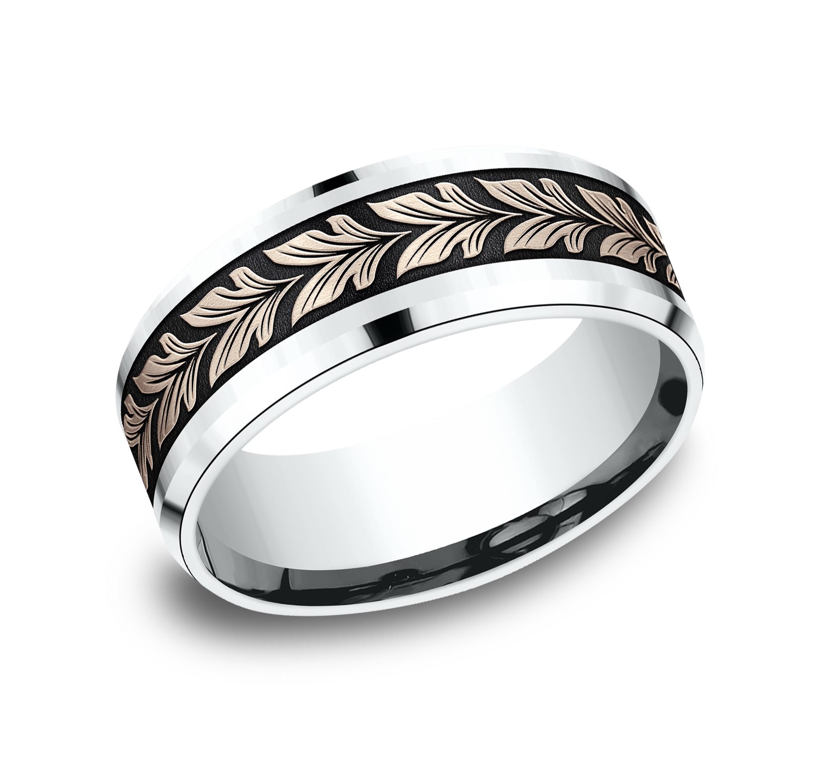 8mm, Comfort fit 14K White and Rose Gold Leaf motif with wear resistant black detailing, polished drop bevel edges
