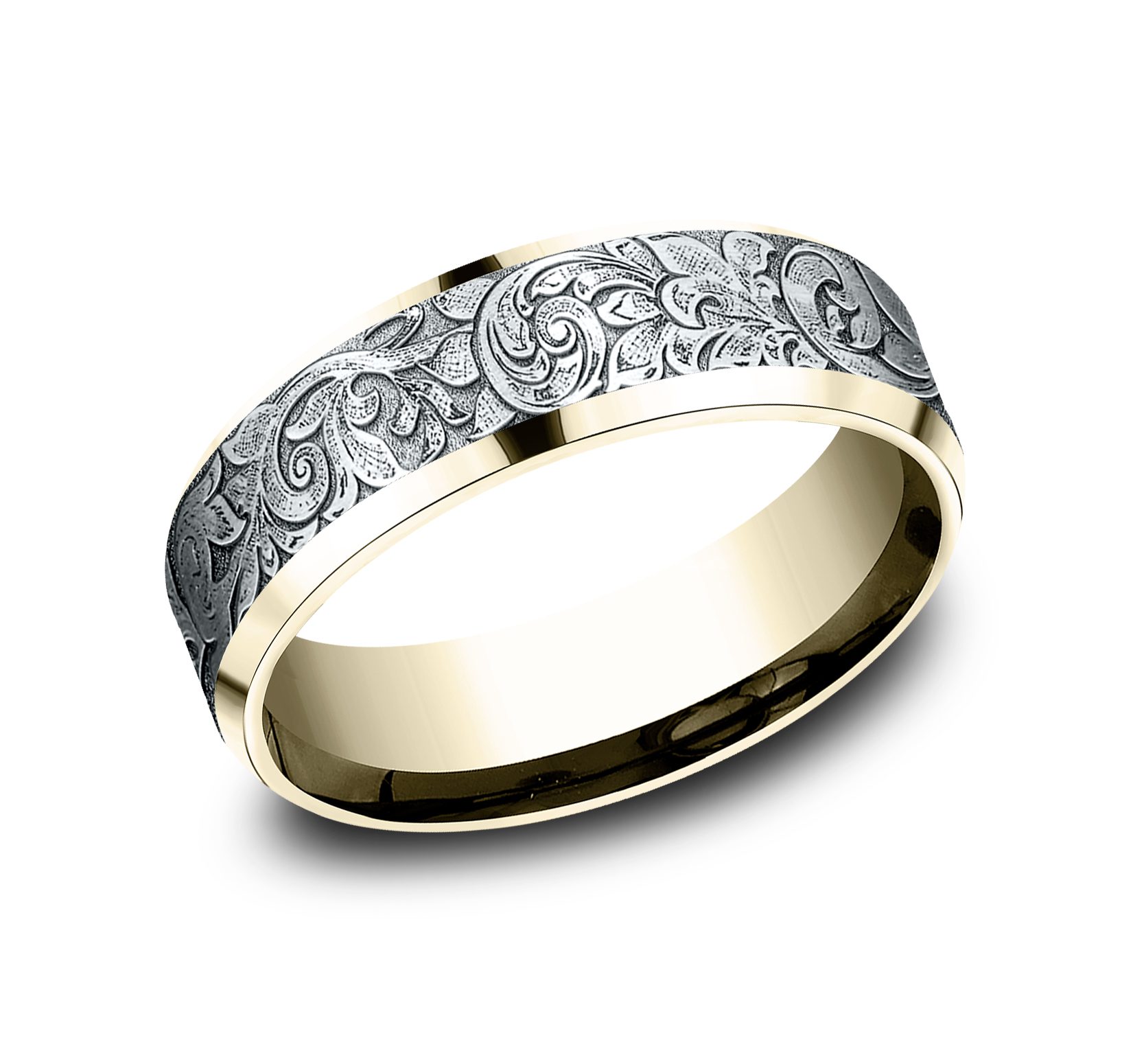 7mm, Lightweight comfort fit 14K Yellow and White Gold London script patterned center, polished bevel edges