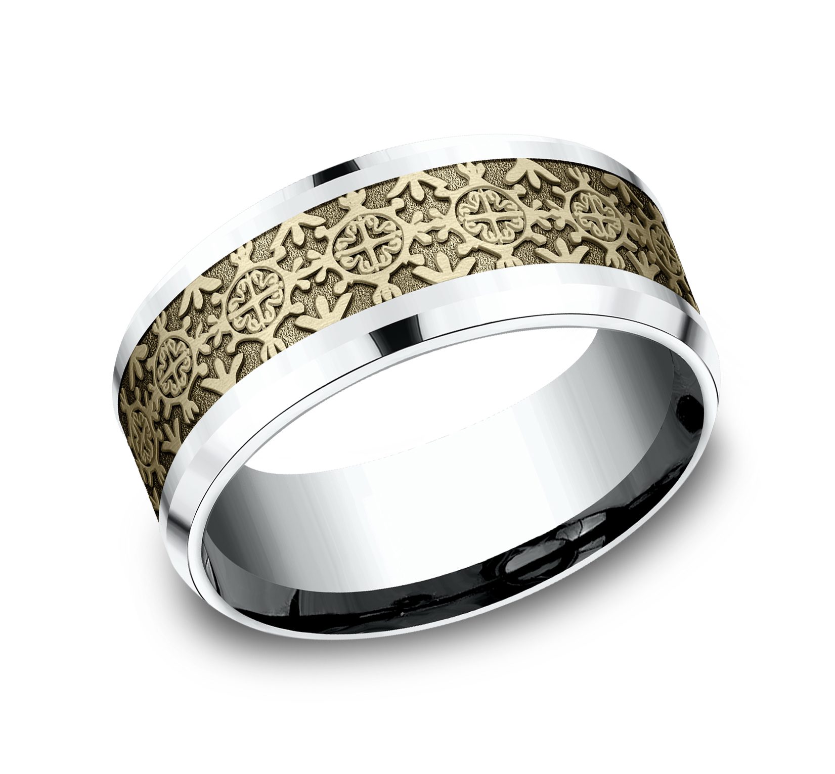 9mm, Comfort fit 14K White and Yellow Gold Intricate patterned center, polished bevel edges