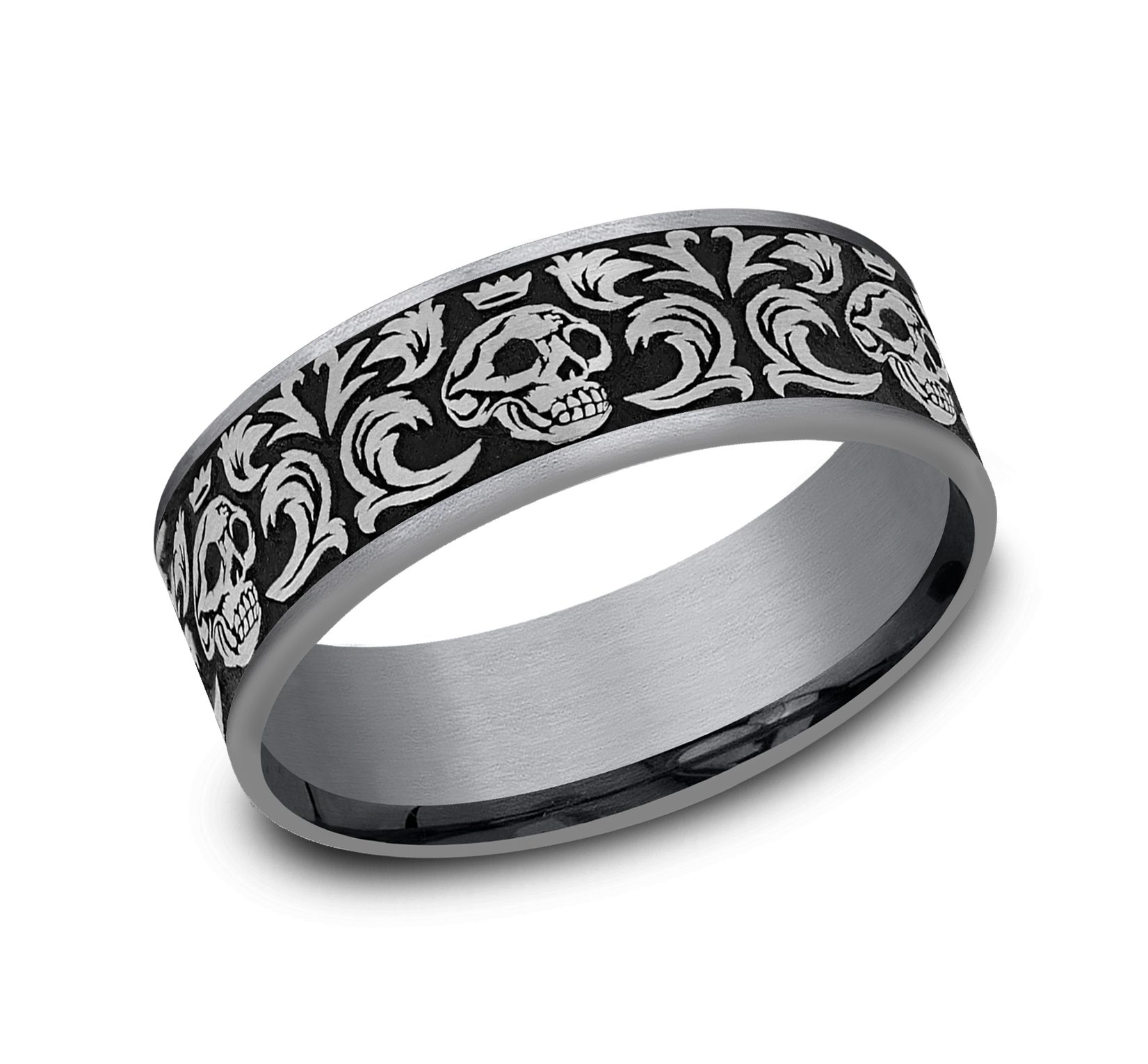 7.5mm, Comfort fit Grey Tantalum and Grey/Black Titanium Skull king pattern, thin edges