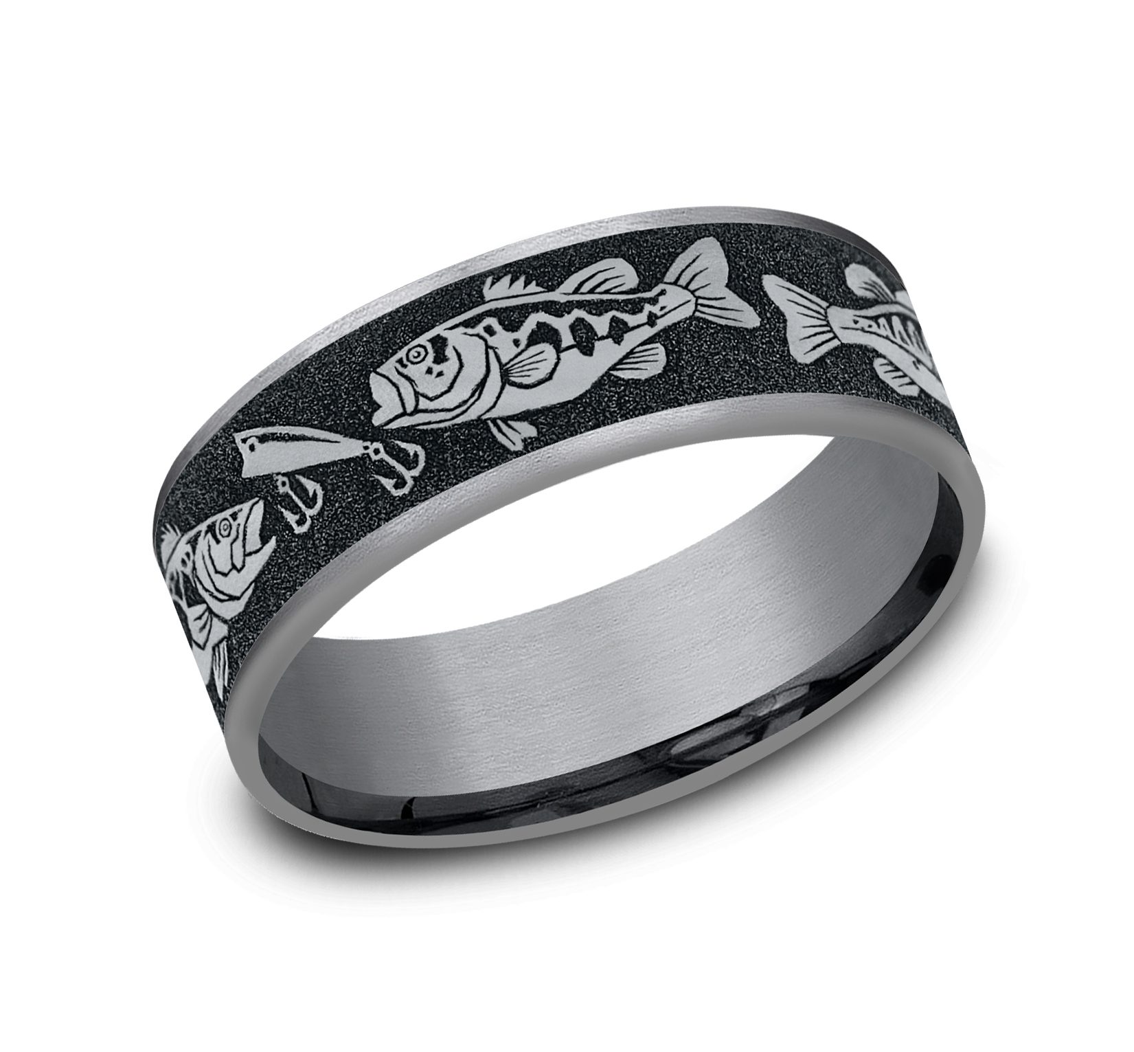 7.5mm, Comfort fit Grey Tantalum and Grey/Black Titanium Bass bait pattern, thin edges