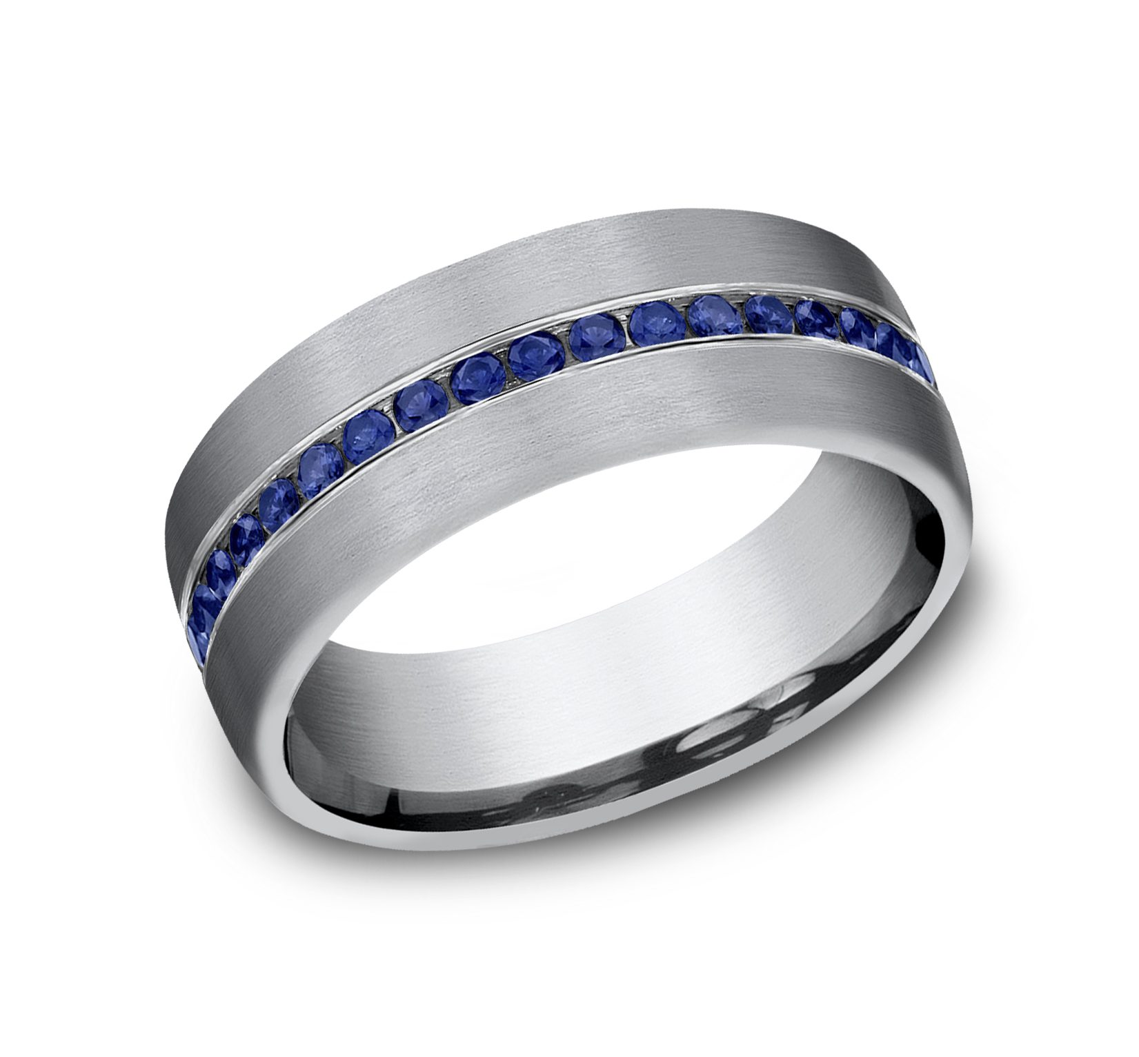 7.5mm, Comfort fit Grey Tantalum Satin finish 20 channel set blue sapphires Carat weight is .40ct