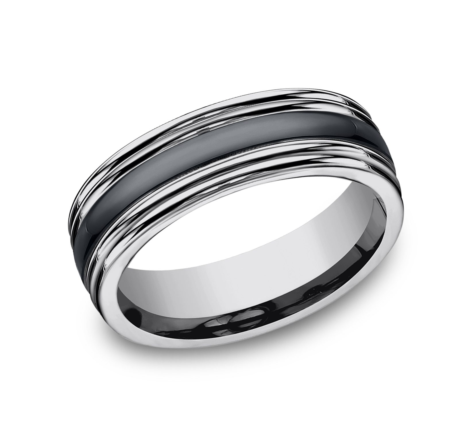 7mm, Comfort fit Tungsten and Black Ceramic Polished center, polished double cut round edges
